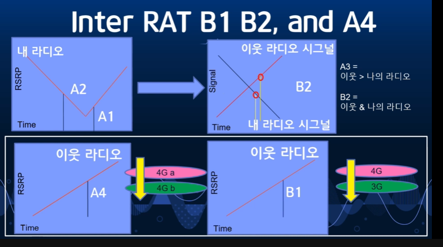 Inter RAT은 다른 이동통신 규격으로 handover할 때 사용하는 기술이다. 이벤트로는 B1, B2, A4가 있다.