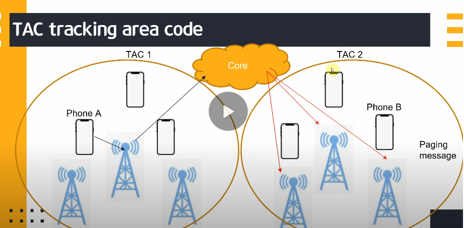 우리 말단 TAC2의 gNB들은 열심히 Phone B를 찾기 시작한다. 이때 페이징 메시지를 TAC 내에서 브로드캐스팅해서 단말을 찾아낸다. 즉, 페이징 메시지는 통신망(TAC)내 에서 단말기를 찾기 위해 네트워크가 주기적으로 방송하는 메시지인 것이다. 추가로 페이징 메시지는 컨트롤 메시지에 속하는데 통신 과정에서 제어, 관리를 목적으로 하기 때문이다. (중요!)