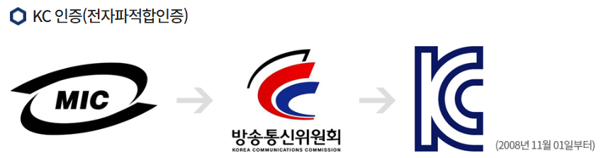 우리나라의 경우엔 개별 마크를 사용하다가 국가통합인증마크로 통합하여 KC마크를 사용하고 있고, 아래 그림과 같이 생겼다.