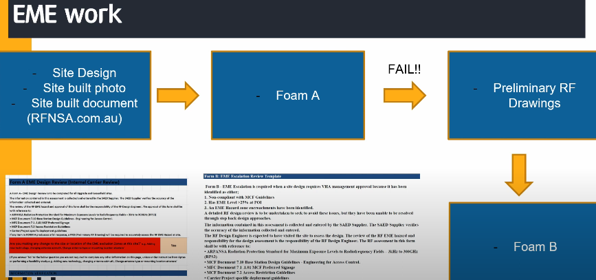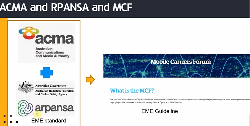 우선 ACMA와 ARPANSA가 EME 표준을 만든다. 그 다음 MCF라는 포럼을 통해서 각 이통사들이 모여 EME 가이드라인을 만든다. 표준을 바탕으로 EME 가이드라인에는 자세하고, 세부적인 내용을 추가한다.