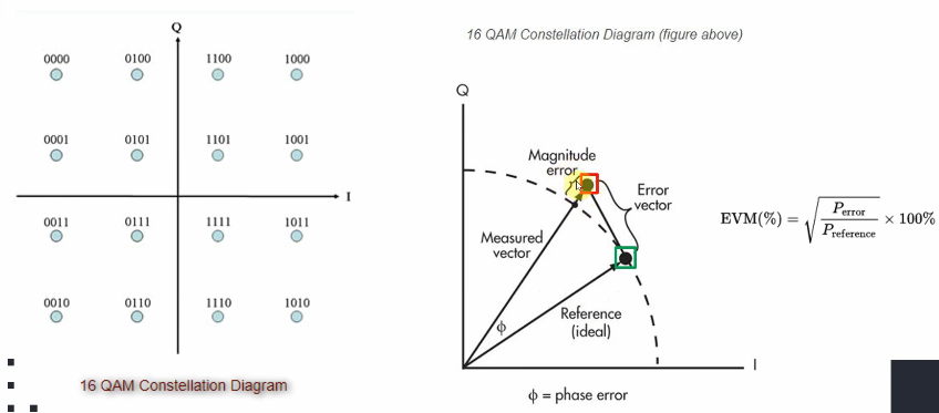EVM을 측정하기 위해서 그림의 16QAM을 예시로 들어보겠다. 16QAM은 Phase와 Amplitude를 다르게 하여 16개의 파형을 만든 것이다. 만약 0111의 데이터에 에러가 발생했다면 오른쪽처럼 계산하여 EVM(%) 측정 가능하다.