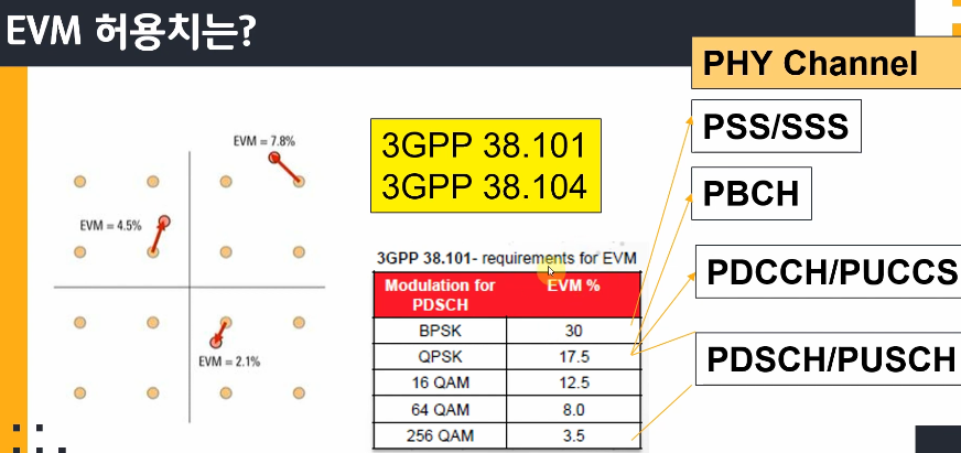그림을 보면 변조방식에 따라 EVM 허용치가 더 엄격해지는 것을 알 수 있다. 변조 방식이 복잡해질 수록 더 자세하게 데이터를 표현할 수 있게 되는데 이럴수록 데이터는 에러에 더 민감해진다. 따라서 에러 허용치가 줄어드는 것이다.