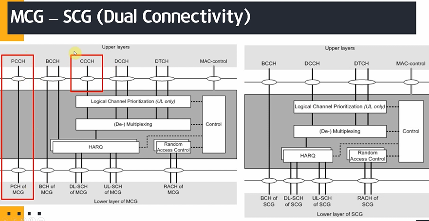 MAC 계층에서 MCG가 왼쪽 SCG가 오른쪽의 구조를 가지고 있다. 보면 MCG에는 PCCH, CCCH가 있는 것을 확인할 수 있다. 페이징을 담당하고, 초기 연결을 담당하는이 MCG에만 있는 이유는 결국 SCG는 네트워크에 연결 된 이후 사용되기 때문에 이 채널들이 굳이 필요 없기 때문이다.