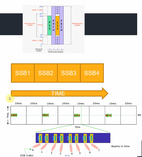 20ms를 간격으로 빔스위핑을 하게 되고 5ms 안에 SSB 신호를 쏘게 된다. 이 때 한 개의 빔만 쏘는 것이 아니라 여러 빔을 5ms 안에 쏘고 이렇게 빔을 쏘는 것을 빔 버스트(Beam Burst)라고 한다.