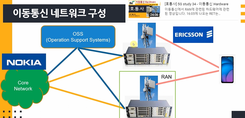 모든 정보를 담당하고 있는 Core network를 시작으로 기지국-UE 순서로 볼 수 있는데, 이 때 기지국은 안테나-BBU/RRU-AAU 등으로 이루어져 있다. 이와 관련된 자세한 정보는 34.이동통신 Hardware에 있으니 참고하자.
