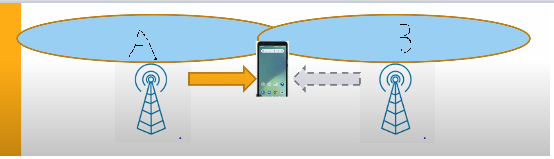 A쪽 Cell의 엣지(Edge)에서 UE가 호통사 영상을 시청 중이다. 그리고 아주 우연히 B쪽 Cell의 엣지에서도 UE가 똑같이 호통사 영상을 보고 있다. 각 Cell의 엣지는 A와 B Cell이 겹치는 구역이다.
