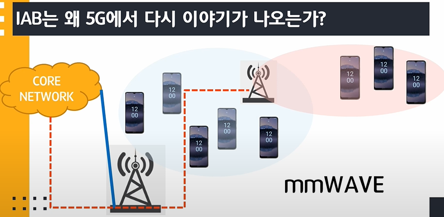 하지만 5G에서 IAB는 다시 등장하였다. 바로 mmWAVE 덕분이다. mmWAVE는 넓은 대역폭을 가지는 대신 좁은 커버리지를 가지는 것이 특징인데 넓은 대역폭이 IAB의 대역폭 문제를 해결줄 수 있기 때문에 IAB가 재등장 했다고 볼 수 있다.