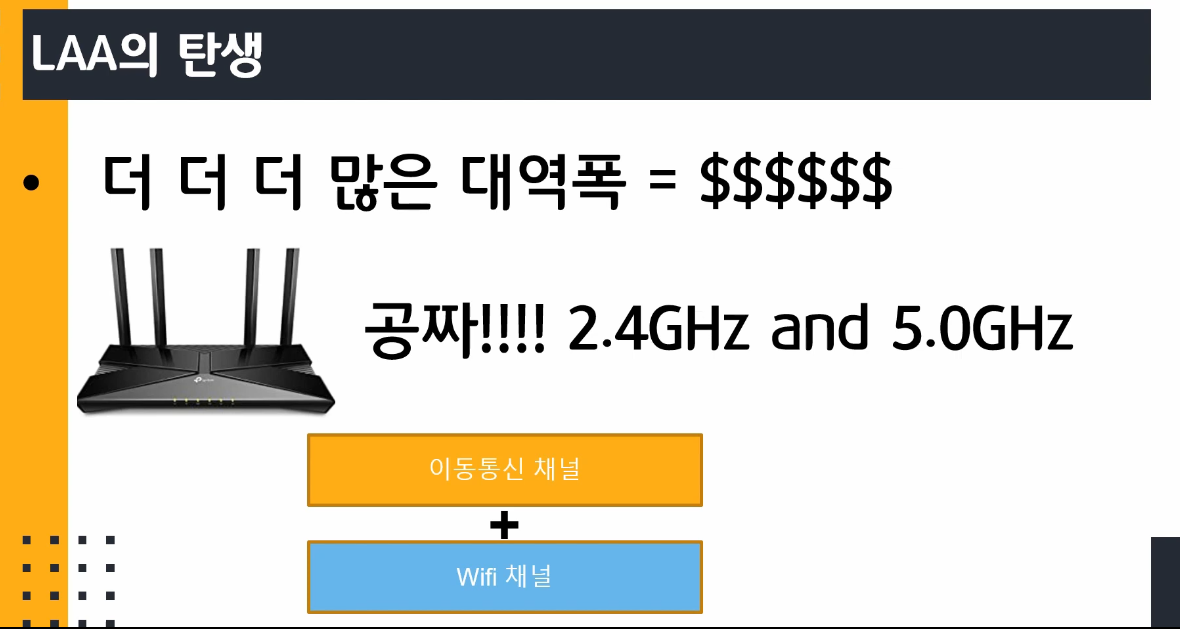 각설하고 오늘은 LAA에 대해서 알아보려고 한다. Licensed Assisted Access라는 뜻으로 이 기술은 비면허 주파수 대역을 사용하는 기술이다. 뭔 소린가 싶을텐데 한번 잘 따라와보도록!