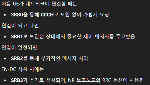 SRB 0 - RRC 메시지 전송. CCCH(Common Control Channel) 사용. 연결 초기 단계에서 사용. 보안 설정 이전에 사용. 간단한 연결 요청 등